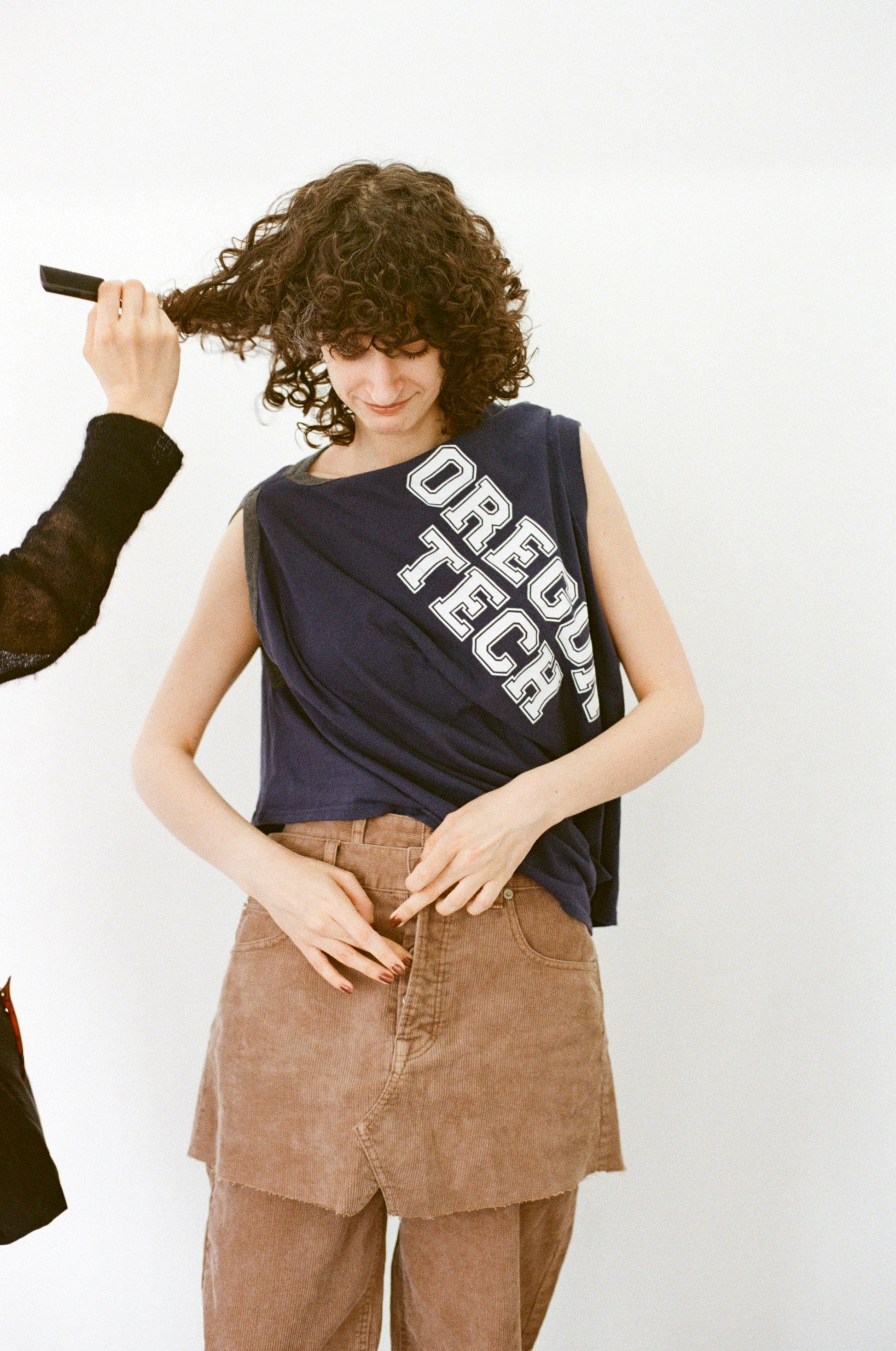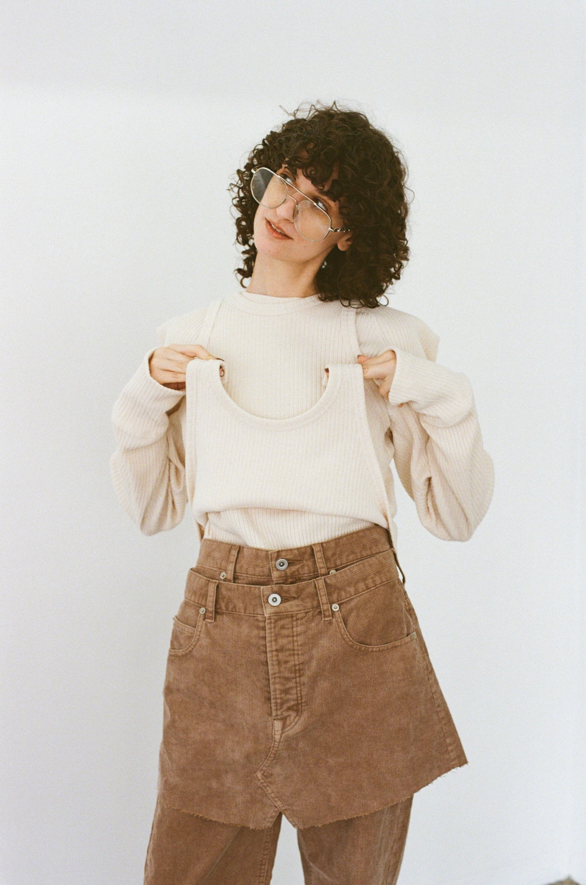 コーデュロイ素材で仕立てた、パンツとスカートのセットアップ。